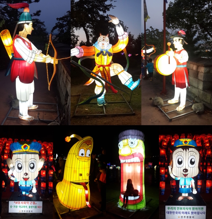 ![]() 안녕하세요. 장은주가이드입니다^^ 코스모스가 만개한 가을이 왔네요~ 북천코스모스와 진주유등축제를 다녀왔습니다. 이날은 햇빛은 쨍쨍하고 바람은 시원해서 여행하기 아주 좋았답니다 ㅎㅎ ![]() 먼저 주차장에서 하차한뒤 북촌역까지 걸어가보았습니다. 쨍쨍한 햇빛에 조금 덥긴했지만 10여분정도 걸으니 작은 핑크색의 북촌역을 만날수있었습니다~ ![]() ![]() 기차역에 들어서서 기찻길 옆으로 코스모스가 너무 이쁘게 펴서 팻말처럼 한참을 정지해 있었습니다 >< 역안에는 지금은 쓰이지 않는 기차선로를 걸을수 있게 되어있어 걸으면서 사진도 찍고 요런 예쁜 신호등도 보았어요~ ![]() 북촌코스모스역에서 다시 주차장 쪽으로 와서 2000원의 입장료가있는 희귀박 터널에도 들어가보았는데요~ 처음보는 여러종류의 박들이 많아서 재미있었습니다. ![]() ![]() ![]() 코스모스밭에 들어가서 사진도 찍다가 시간이 잘 맞으면 요렇게 기차가 지나가는 모습도 볼수있습니다^^ 간혹 사람들이 철길에 많아서 다칠까봐 경적을 크게 울리는데요~ 좀 놀라기도 했지만 재미있었습니다. ![]() 유등축제장까지 길은 조금 막혔지만 해가 지기 전에 도착해서 해가지기전의 유등과 해진후 유등을 모두 감상할수 있었습니다. 소망터널의 유등을 찍어보았는데요~ 만원의 참여료를 내면 소망유등을 달아준다고합니다^^ ![]() 해가지기 전에 먼저 진주성 서문으로 입장해서 성안을 둘러보았습니다. 성외곽과 성안 곳곳에 유등이 너무 많아서 볼거리가 많았구요~ 촉석루 위에 올라서서 축제장을 찍어보았습니다. ![]() ![]() ![]() 성 건너편의 축제장에는 갖가지 유등으로 꾸며져 있고 남강위에 떠있는 유등도 너무 예뻣지만, 무엇보다 제 눈을 사로잡았던 유등은 바로 '라바'였습니다~~ 라바라바~~~~~~ 너무 귀여워서 같이 사진찍고싶었지만 어린이들이 줄을 서있어서 못찍었네요 하핫 다음을 기약하며.... 너무 즐거웠던 북천코스모스와 진주남강유등축제였습니다. |
