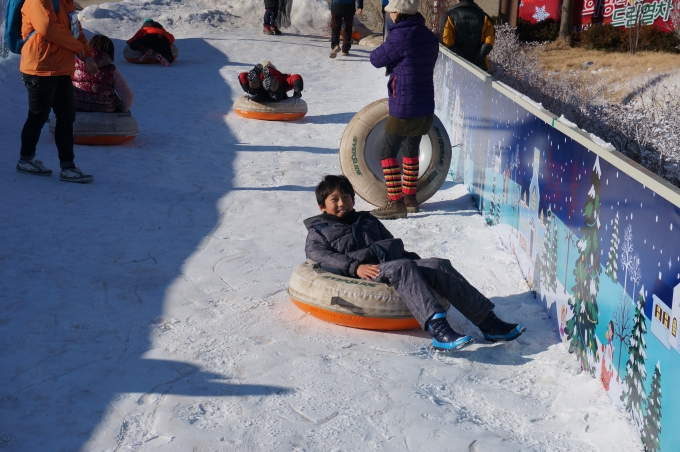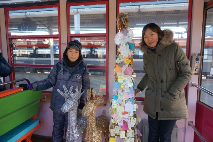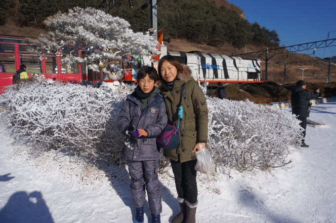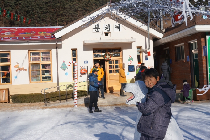 안녕하세요? 이번에 삼성여행사로 기차여행을 처음다녀온 새내기입니다. 여행이 너무 좋아서 5학년 아들과 1년에 자주 테마여행을 다녀오지만 이렇게 기차여행을 처음입니다. 이번 겨울방학에 기차여행을 가려고 엄청나게 검색하고 준비한 아들 도현이 덕분입니다.^^* 인터넷으로 기차여행을 폭풍검색하더니 삼성여행사의 여행상품까지 골라서 예약하자고 하더군요^^; 이렇게 인연을 맺게된 이번 여행!! 지금부터 궁금하신분들께 도움이 되고자 자세히 소개해드릴려고 합니다. 이번여행의 시작은 부산역에서 출발하는 새벽 5시 KTX 기차에서 시작됩니다. 부산역에서 KTX를 타고 새벽5시 출발해서 동대구역 도착한뒤, 동대구역 여행센터앞에서 "삼성여행사"의 서샛별 가이드님과 처음만났습니다. 간단한 미팅후에 다시 동대구역에서 무궁화기차를 타고 2시간넘게 달려서 영주역에 도착~! 가는동안 서샛별가이드님께서 여행코스설명과, 아주 잘구경하고 즐길수 있는 포인트까지 설명해주셨어요 ㅎㅎㅎ 이 영주역에서 우리는 그토록 타고싶었던 백두대간 협곡열차 "V-트레인"에 탑승했습니다. ![]() ![]() 협곡열차 내부 보이시나요? 의자가 창밖 볼수있게 배치되어있기도 하고 기차전체 색깔도 너무 예쁩니다. ![]() ![]() 열차 내부에 크리스마스시즌을 맞이하여 예쁜 트리장식도 있고, 터널을 지날때마다 이렇게 기차천장이 야광빛을 발합니다. 열차가 터널을 지날때마다 사람들이 "우와~"하고 환호성을 질렀습니다^^ *V-트레인 기차의 V는 협곡(velley)의 약자이며 동시에 협곡의 모양을 의미한다고 합니다. 국내최초의 개방형 관광열차로 영주역에서 철암역까지 운행하며, 자연을 가까이에서 볼수있도록 협곡구간을 계속 달립니다. 동절기에는 히터대신 목탄난로를 사용하고, 여름에는 창문을 개방하고 선풍기를 쓴다고 하더군요^^ 실제로 이번 여행에서 기차내부에 히터대신 목탄난로에 불을 지펴서 객실을 데워주셨답니다. 처음기차를 탈때는 너무 추웠는데 해가 뜨고 목탄난로를 떼우니깐 점점 따뜻해졌어요~ ![]() ![]() 철암역까지 가는동안 계속해서 여러번 간이역에 잠깐씩 세워주면 내려서 구경을 했습니다. (간이역코스 :영주역에서 출발 ㅡ>분천역 ㅡ>양원역 ㅡ>승부역 ㅡ>철암역도착) 1)분천역 : 역에 바로 유명한 분천 산타마을이 있습니다. 겨울 산타를 테마로 한 관광지로서 산타까페,초대형트리,간이썰매장,눈사람등 볼거리와 놀거리가 있었습니다. 도현이는 작은 썰매장이지만 여러번 눈밭을 구르면서 열심히 썰매를 탔습니다. 그리고 바로 옆으로 조금 내려가면 곳곳에 군밤, 붕어빵, 옥수수,오뎅등 먹거리도 많이 팔고있습니다. 역쉬 겨울에 가면 오뎅국물등 따뜻한음식이 제일인것 같아요 ㅎㅎ 저희는 기차를 다시 타기전에 오뎅도 먹고 삶은 옥수수와 붕어빵을 사서 다음역 가는동안 정말 맛나게 먹었습니다 겨울마다 산타마을 관람기간이 있다고 하니 참고하셔요~~ (이번 분천역 산타마을 관람기간: 2014.12.20~2015.01.18) ![]() ![]() ![]() ![]() 2)양원역: 전국에서 가장 작은 간이역입니다. 주민들이 직접 만들었다고 합니다. 이곳에서는 잠깐 기차를 내린동안 줄서서 맛본다는 막걸리가 아주 유명합니다. 처음 협곡열차를 탈때부터 우리 삼성여행사 서샛별 가이드님께서 목소리 높여 외치던(?) 막걸리를 한잔할수있는 역입니다. 막걸리 1잔에 1,000원인데 막걸리를 마시면 돼지껍데기 볶음을 공짜안주로 조금 줍니다. 그맛도 기막히다고 하던데요... 어르신분들이 제일 좋아하실 코스같아요 ㅎㅎㅎㅎ^^;; 한겨울에도 시원하게 넘어간다는 막걸리도 한잔마시고, 입맛을 당기는 돼지껍데기볶음으로 안주삼아 한잔하는게 그리 오래 기억에 남는다고 합니다. 그맛을 못잊어서 다시 찾는다고 하네요^^;;; 안따깝지만 전 못마셨어요 ㅠㅠ 그밖에도 여기서 농산물도 싸게 구입할수 있습니다 . 3)승부역: 하늘도 세평, 꽃밭도 세평이라는 승부역은 잠깐 내려서 풍경구경을 열심히했습니다. 4)철암역: 원래 석탄채굴이 활발했을 당시에 여객,화물수송으로 큰역활을 했던 역이라고 합니다. 이렇게 철암역에 도착할때까지 협곡열차를 실컷 즐길수 있었네요^^* 철암역에서 도착하고 나서는 바로 또 버스로 갈아타고 태백시내의 "황지연못"으로 출발했습니다. 여기 황지연못은 남쪽으로 흐르는 낙동강 1300리의 발원지라고 합니다. 이곳에서 흘러나온물은 영남평야로 흘러들어가서 강을 이룬다고 하며, 한국명수 100수중 한곳으로 전해진다고 합니다. 땅속에서 쉴새없이 하루종일 5천톤에 달하는 물이 용출되어 그 물이 계속해서 영남평야로 흘러들어간다네요. 낙동강의 발원지라는 사실이 너무 신기해서 다시 황지연못을 보게 되었습니다.. ![]() 그리고 점심떄가 되어 가이드님이 태백 황지시장내의 맛있는 음식을 몇가지 소개해주셔서 점심먹으러 고~!! 바로 우리가 선택한 점심메뉴는 태백의 "물닭갈비" 입니다. 물닭갈비 들어보셧어여? 닭갈비는 많이 먹어봣어도 물닭갈비는 처음이라 신기했습니다. 음식이 나오는데 그 푸짐한양에 놀라고, 맛에 한번더 놀래고..음....매운닭갈비탕같은 느낌? 먹느라 정신팔려서 사진못찍어요.. 팁을 알려드