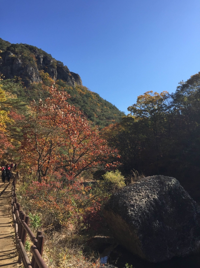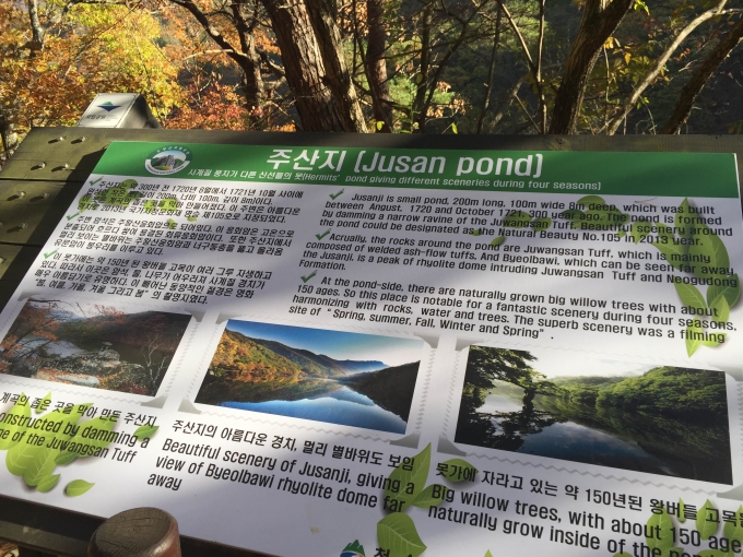 안녕하세요 10월의 마지막날 가을 여행 주왕산 주산지 후기 올려보겠습니다 ^^ 대구에서 출발해 영천 휴게소를 거쳐 고불고불 산길을 따라 청송 주왕산에 도착하였습니다 ! 아침일찍 서두른터라 다행이 마지막 주차장을 선점 ! 하이킹이 시작되었습니다 ! ![]() 떨어진 낙엽도 많았지만 남은 색색의 나무들과 풍경이 정말 너무 아름다웠습니다 ~ 덕분에 올라가는 길에 전혀 지겹지 않고 카메라 드느라 정신이 없었지요 ~ ![]() 아래의 사진은 시루봉입니다. 떡 찌는 시루를 닮았다 해서 시루봉이라 하는데 자세히 보면 사람 얼굴 같기도 합니다 ~ ![]() 사진이 살짝 뒤죽박죽인거 같은데요 (너무 많이 찍는 바람에 ^^ ;;) 정말 사진으로 다 담을 수 없는 풍경이 계속 펼쳐 졌답니다 ![]() ![]() 암산이다 보니 정말 돌이 많았는데요 넘 신기했어요 어느 순간 다 다랐을때 첫번째 폭포, 용추 폭포가 두둥 ! 몇몇 사람들이 우와 ~ 하니 저도 덩달아 우와 ~ 하게 되더라구요 ~ ![]() ![]() 쭉쭉 더 올라가 봅니다. 이미 대전사(시작점) 에서 3.1km를 올라왔는데요 ~ 제 3 폭포 용연 폭포 까지 가봅니다 ~ ![]() 짜잔 ! 정말 숨겨진 폭포네요 ~ 날씨도 화창하고 물과 공기도 좋고 깨끗하고 ~ 기분이 더 상쾌해 졌답니다 ![]() ![]() ![]() ![]() 단풍과 어우러진 주왕산 정말 멋있지요 ~ 예전에는 돌이 병풍을 친 것 같다 하여 석병산이라고 불렀다 하네요. 정말 듣고 보니 병풍 친 것 같죠? ![]() 내려 와보니 청송 사과의 고장답게 사과 자판기가 있더라구요 ~ 사과 한알에 천원씩, 사과 즙 천원씩 팔더라구요 ~ 저도 주왕산 올라갔다 온 기념으로 사과즙 하나를 뽑아 먹었는데요 ~ 정말 맛있었어요 정말 !!! ![]() 그리고 다음 코스 주왕산에서 15분 정도 차를 타고 가면 주산지를 갈 수 있는데요. 봄여름가을겨울 영화 촬영지로 유명한 곳이죠 ~ ![]() 왕 버들나무가 이렇게 똬악 ! 자리 잡고 있었습니다 ~ ![]() 오후 느즈막히 햇빛의 반짝임과 호수가 너무 잘 어우러져 가을의 풍경을 한 껏 더해주고 있네요 ~ ![]() ![]() 주산지는 왕복 한시간이면 충분히 다녀올 수 있는 코스였고 무난하게 누구나 걸어볼수 있는 코스였답니다 ~ 여행을 마무리 하고 대구로 오는 길에 해가 지는 모습이 너무 아름다워서 찍어보았어요 ~ ![]() 비록 대구에 다와서 많이 막혀 고생을 하였지만 그래도 가을의 정취와 분위기를 담고 돌아오니 뿌듯하고 풍성한 기분이었답니다 ~ 이 날 저와 두번째로 본 고객님이 두분이나 계셨는데 다음에 또 기회가 되서 뵈었으면 좋겠네요 ~ 이렇게 여행사에서 다니니 좋네요 ~ 라고 해주셨던 분들, 편하게 다녀와서 좋았다고 하셨던 모든 분들, 그리고 시간도 잘 지켜주시고 즐겁게 여행해주신 분들 덕에 마음 든든히 또 가이드를 하루 마칩니다. 감사합니다 ^^ |