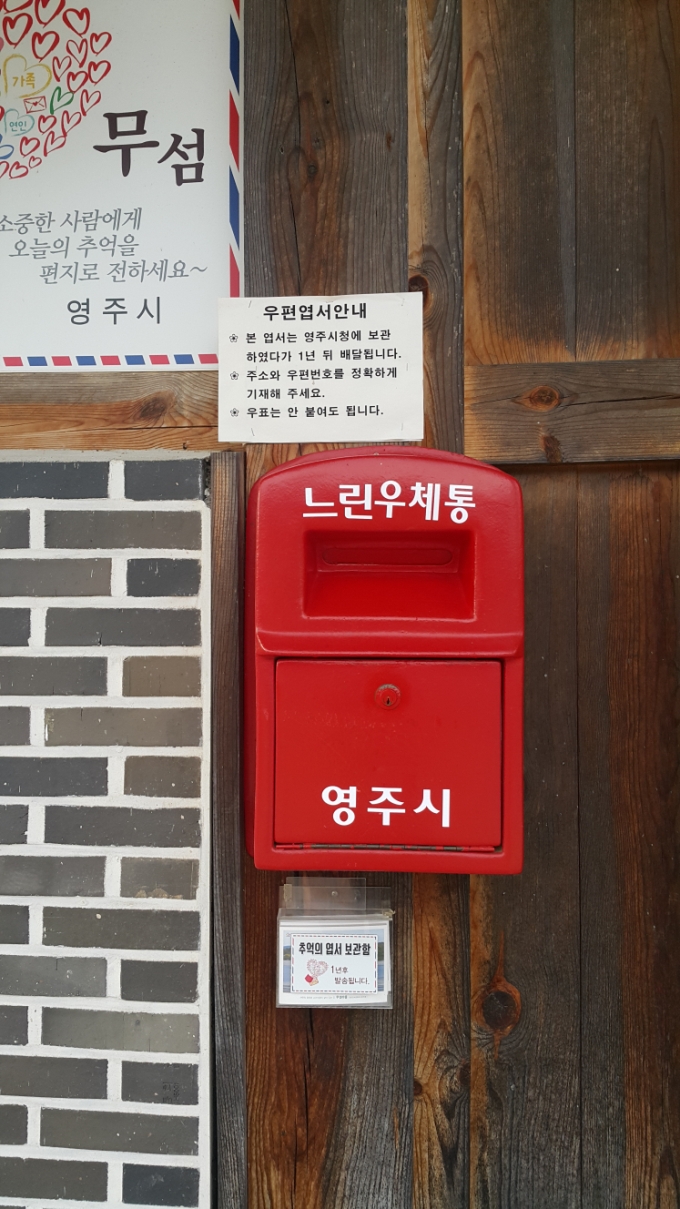 한번씩은 조심 조심 건너갔다가 오셨습니다 ㅎㅎ 물은 깊지않지만 외나무 다리 위에서는 조금 어지러우니 다리만 보고 건너는 것이 포인트!! ![]() ![]() ![]() 무섬자료전시관 대문에는 느린 우체통이 있습니다!