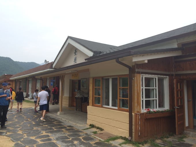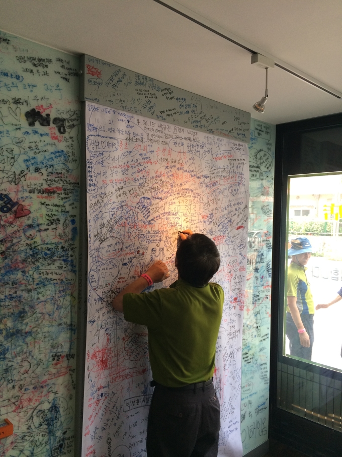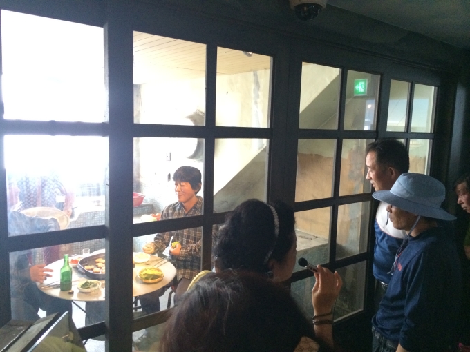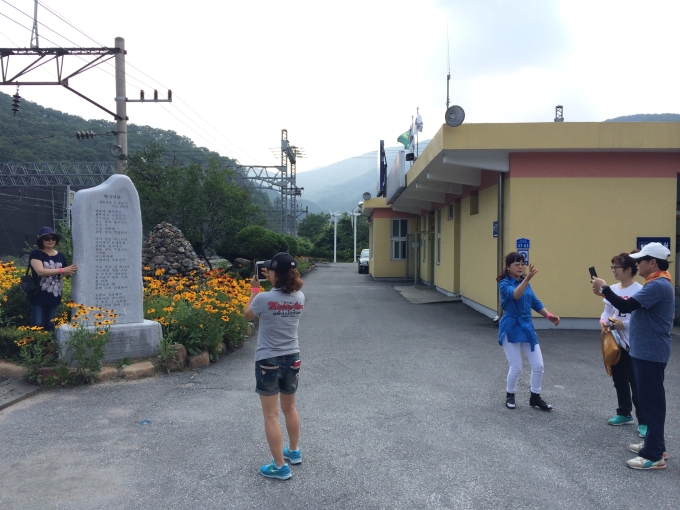 협곡구간의 석포 역을 지나면서 협곡열차 승무원들이 아리랑 노래에 맞춰 난타 공연을 준비했는데 정말 재미있게 잘 보았습니다. 개인적으로는 왼쪽분이 오른쪽분보다 더 리듬을 잘 타시는 것 같더군요 ^^ 협곡열차 일정을 마치고 태백의 이명숙 문화관광해설사님과 함께 첫 번째로 철암탄광역사촌으로 이동합니다. 그 당시 광부들의 생활상을 엿볼 수 있게 새로이 리모델링된 곳입니다. 역시나 이날도 방명록을 남기시는 삼성여행사 손님의 모습입니다.